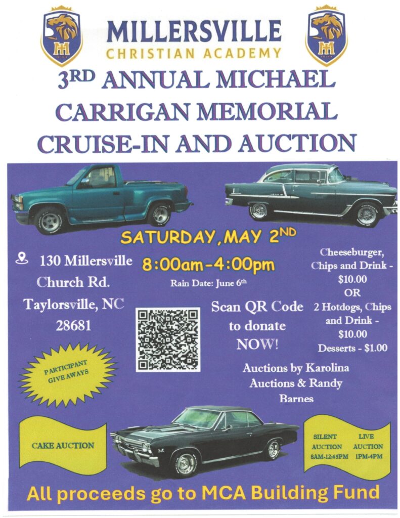 Millersville Christian Academy 3rd Annual Michael Carrigan Memorial Cruise-In and Auction. Click for Details